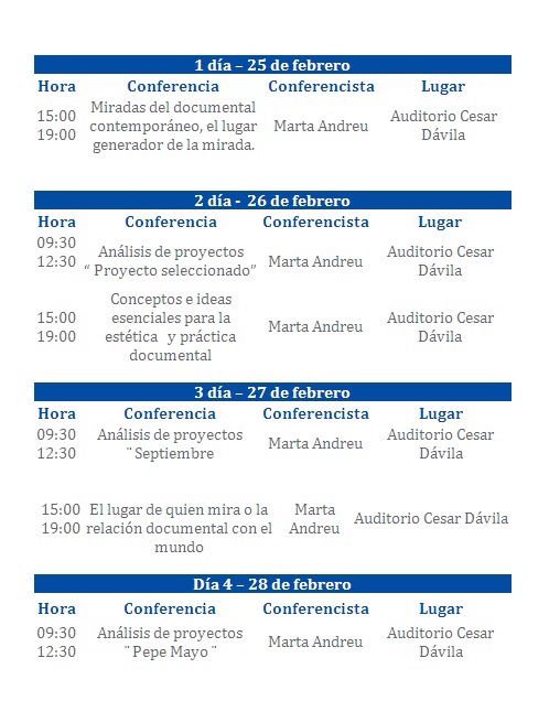 A partir de fragmentos de películas documentales contemporáneas, Marta Andreu nos hará viajar por estos cuestionamientos esenciales de la estética cinematográfica que surgen a partir de la construcción de un guión documental. Al mismo tiempo ira analizando los proyectos que fueron seleccionados, de acuerdo a la pertinencia frente al tema o autor tratado. De esta manera los proyectos serán analizados y retroalimentados durante todo el taller por Marta, y en el último día también por todos los participantes.
